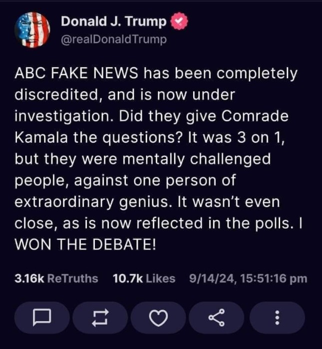 Given that, in order to win, he needs to bring voters to him that are not already a part of his dedicated cult/core following, Trump is surely not going about it in any credible way. The man is so very, very clearly utterly deranged. I also think Kamala’s campaign has recognised this and will be playing him like a hooked trout all the way to 5 November. Very encouraging.